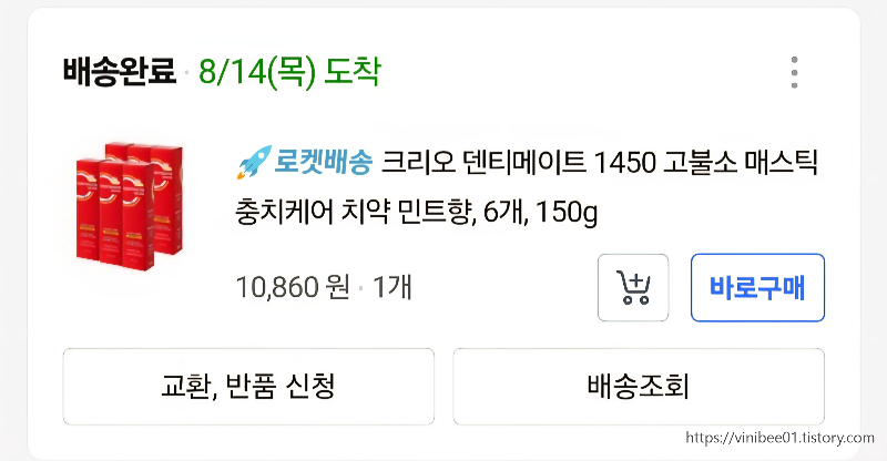 가격적인 부분도 큰 장점이다. 쿠팡에서 6개 묶음을 10,860원에 구입했는데, 개당 2천 원도 채 안 된다. 같은 고불소 치약 브랜드인 뷰카 치약은 4개 세트가 만 원대 중후반으로 개당 3천 원 이상 하는 경우가 많다. 단가만 놓고 보면 크리오 덴티메이트 치약이 훨씬 가성비 좋은 선택이라는 걸 알 수 있다.