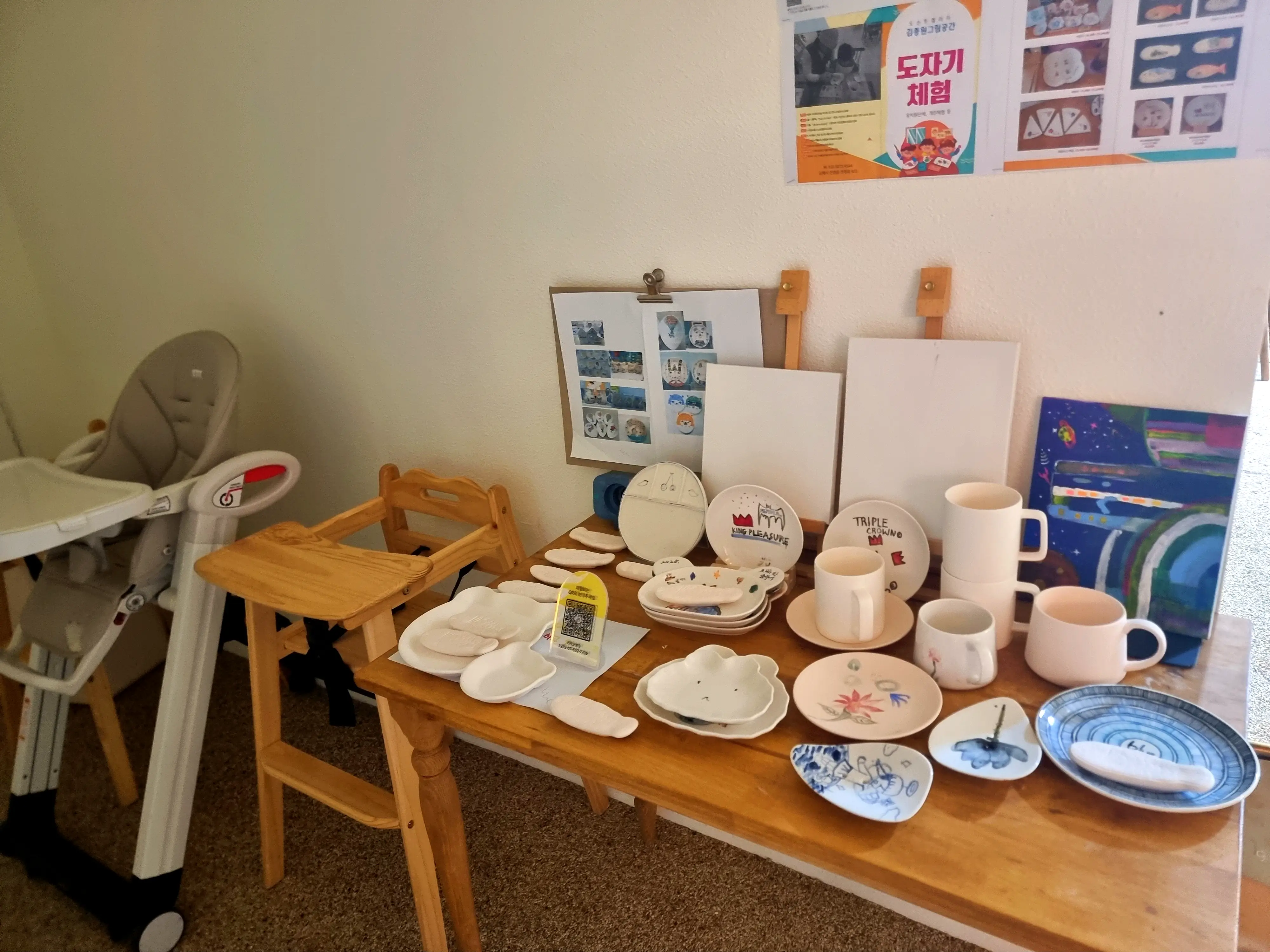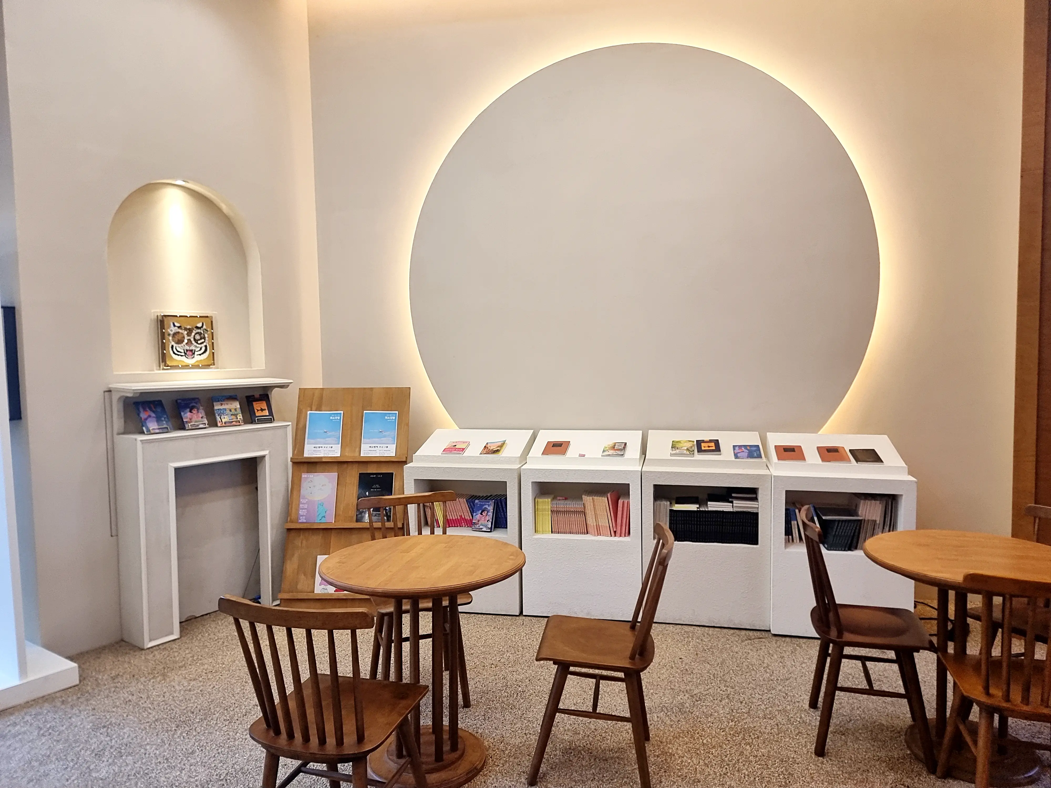 전시장 입구 한쪽에는 도자기 체험 예시 작품들이 전시되어 있어, 어떤 방식으로 체험할 수 있는지 미리 볼 수 있었습니다. 소품처럼 귀여운 도자기들이 놓여 있었는데, 직접 도자기에 그림을 그리는 프로그램을 운영하는 듯했어요. 또 카페 한켠에는 책이 전시되어 있어 읽을 수 있었고, 일부 작품과 소품은 구매도 가능하다고 하니 문화·예술을 가까이에서 느낄 수 있는 공간이었습니다.