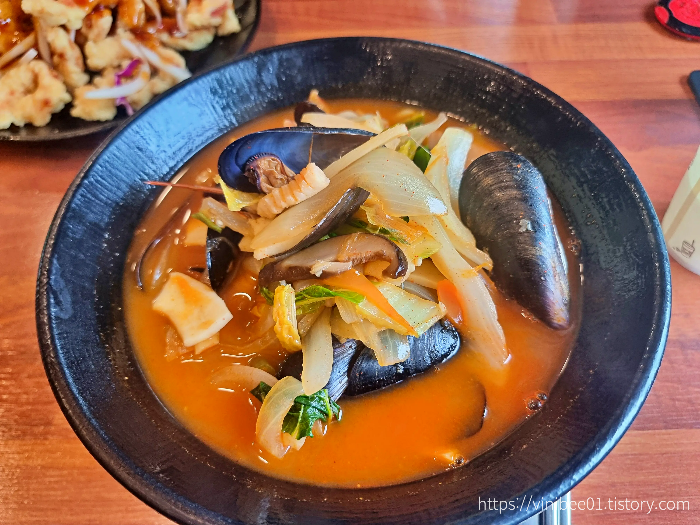 해물짬뽕 가격은 7,000원. 저는 맵찔이라서 맵기만 하면 기침을 많이 하는데, 이 집 짬뽕은 적당히 얼큰하면서도 편하게 먹을 수 있었어요. 국물이 자극적이지 않고 부드럽게 넘어가서 제 입에는 잘 맞았답니다. 다만 매운맛을 제대로 기대했던 남자친구는 조금 심심하다, 밍밍하다라는 반응을 보였어요. 그래서 이 집 짬뽕은 매운맛 강도보다는 “누구나 무난하게 먹을 수 있는 깔끔한 스타일”이라고 말할 수 있을 것 같아요.