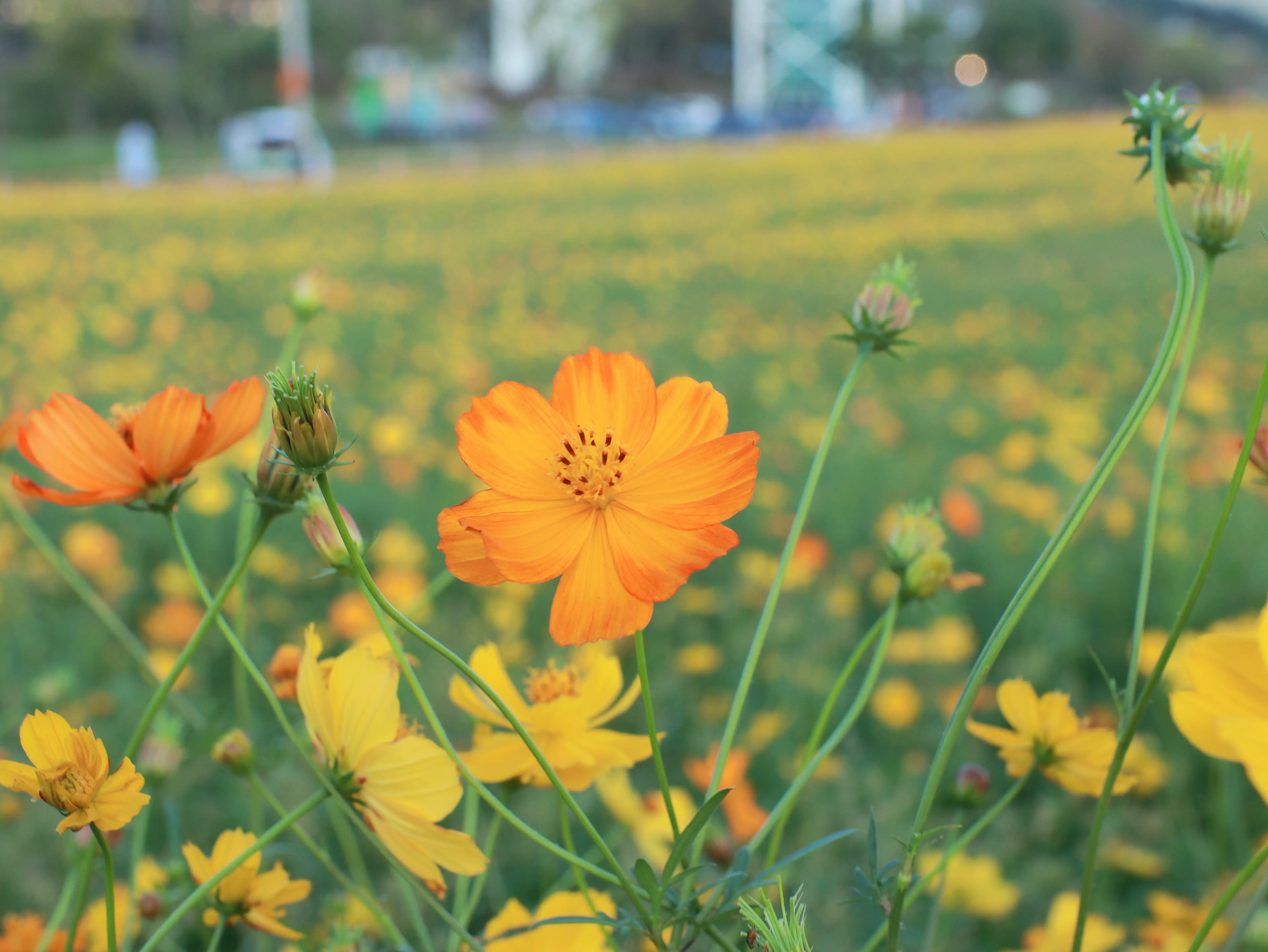 황산공원에서 가장 눈에 띄는 계절의 풍경은 바로 황화코스모스입니다. 흔히 떠올리는 분홍빛 코스모스와 달리, 황화코스모스는 노랑과 주황빛이 섞여 따뜻한 빛을 전합니다. 손바닥 위에 올려본 한 송이는 마치 햇살을 옮겨 놓은 듯 반짝이며, 계절이 잠시 머무는 순간을 기록으로 남겨줍니다.